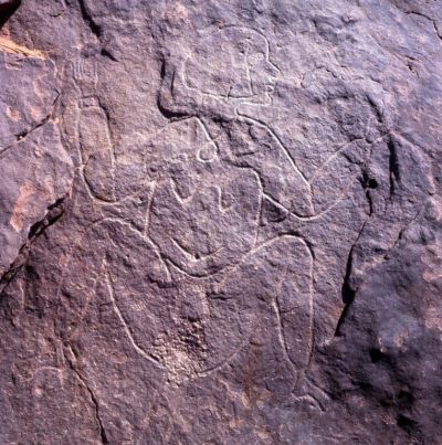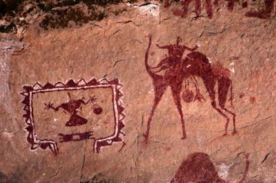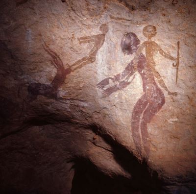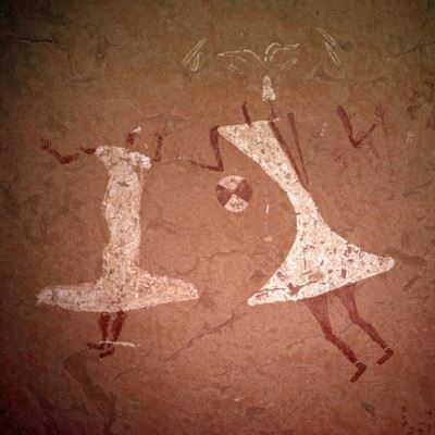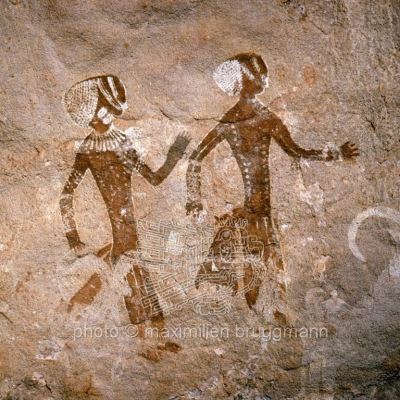 Die Tänzerinnen im zeremoniellen Kleid scheinen lange Tuniken zu tragen, das Band aus Stoff an der Taille könnte ein Knoten sein. Beachten Sie die Struktur der Kappen und die Verzierung der Köpfe. Die Arme tragen viele Ringe. (Tan-Zoumaïtak -Tassili n'Ajjer - Algerien)