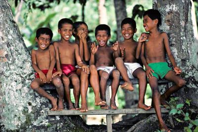 In der Amboine-Bucht auf der Halbinsel Ambon (Indonesien) lassen sich diese Buben nach einem fröhlichen Bad noch so gerne fotografieren.