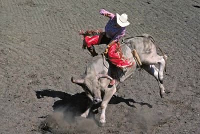 Das «Bull riding» ist zweifellos die gefährlichste Rodeodisziplin. Statt ein Wildpferd muss man einen wütenden Stier zu reiten versuchen, der nicht zögert, den abgeworfenen Cowboy auf die Hörner zu nehmen, wenn dieser nicht schnell genug das Weite sucht (Stampede in Ponoka, Alberta, Kanada).