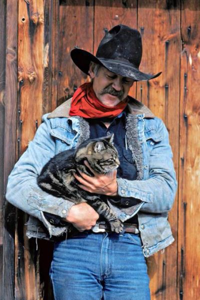 Was haben ein Cowboy und seine Katze gemeinsam? Natürlich den Schnauz. Terry Milliken lebt den Sommer über in einer Hütte in den Rocky Mountains, wo er zusammen mit einigen anderen Cowboys mehrere hundert Rinder ... und eine Katze hütet (Rapsberry Camp, Douglas Lake Cattle Ranch, Britisch-Kolumbien, Kanada).