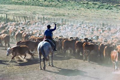 Die Arbeit der Gauchos in Argentinien gleicht jener der Cowboys in Nordamerika: Zusammentreiben der Herden, Trennen der Kälber von den Müttern, um ihnen das Zeichen des Besitzers einzubrennen und eine Ohrmarke zu setzen. Nicht für die Zucht bestimmte Stierkälber werden dabei gleichzeitig kastriert. (Estancia Palitue, Provinz Neuquen).