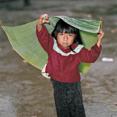 Die Region Loreto im Nordosten Perus, ist eine der feuchtesten und am wenigsten bevölkerten Regionen Perus. Dieses einfache Bananenblatt, gehalten von einem Shipibomädchen zum Schutz gegen den tropischen Regen, stammt aus dem noch unberührten Amazonas-Regenwald... aber für wie lange noch?