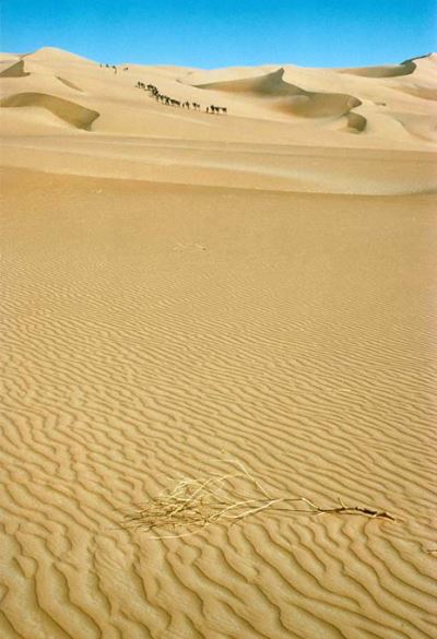 Der Adrar Chiriet, ein riesiges Vulkanmassiv inmitten der Wüste, beherbergt eine kleine Population von Mähnenspringern, dem an den Steinbock erinnernden Wildschaf Nordafrikas, und versperrt den Karawanen den Weg, die das Gebirge mitten im Ténéré umgehen müssen.