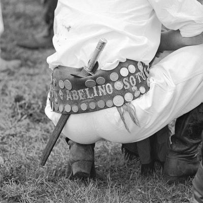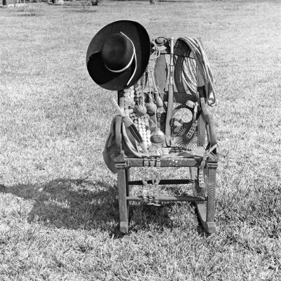 Zur Ausrüstung eines Gaucho in der argentinischen Pampa gehören der typische Hut, die «Boleadoras» oder «Tres Marias» (an einem langen Lederriemen befestigte Wurfkugeln für die Nandujagd), das Lasso, eine Peitsche, der Gürtel mit dem unverzichtbaren Messer («Facón»), die Steigbügel, Sporen und die traditionelle «Bombilla», der ausgehöhlte Koloquintenkürbis, aus dem man mit einem Röhrchen den Matetee saugt.