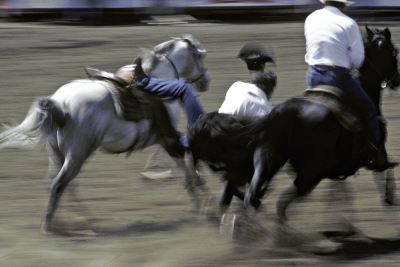 Das «Bull riding» ist zweifellos die gefährlichste Rodeodisziplin. Statt ein Wildpferd muss man einen wütenden Stier zu reiten versuchen, der nicht zögert, den abgeworfenen Cowboy auf die Hörner zu nehmen, wenn dieser nicht schnell genug das Weite sucht (Stampede in Ponoka, Alberta, Kanada).
