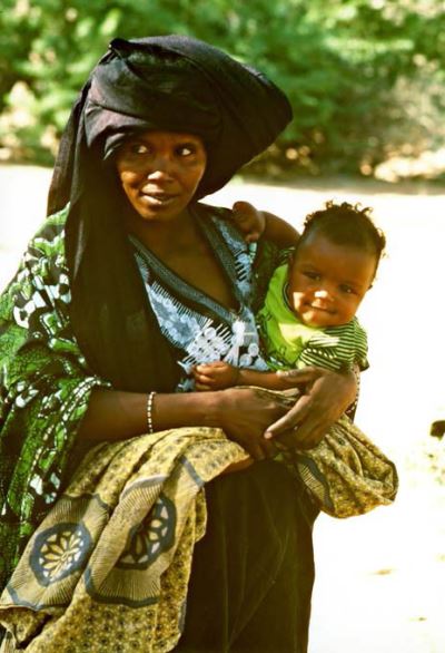 Baptisé «cul-nu» par le photographe, le fils de Sélima cache un minuscule vêtement dans l'ample drapé de sa maman Sélima. Niger / Aïr / Zakkat / 2001