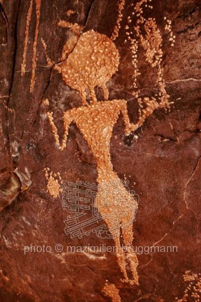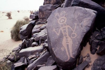 Les danseuses en tenue d'apparat portent, semble-t-il, des tuniques longues, la bande d'étoffe au niveau de la ceinture étant peut-être un nœud. Noter la structure des calottes et l'original ornement des têtes. Les bras portent de nombreux anneaux. (Tan-Zoumaïtak -Tassili n'Ajjer - Algérie)