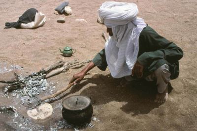 Confection de la taguella, galette de blé cuite dans le sable.