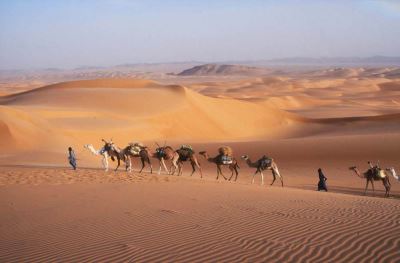 Dans la lumière du matin, caravane dans l'oued Temet