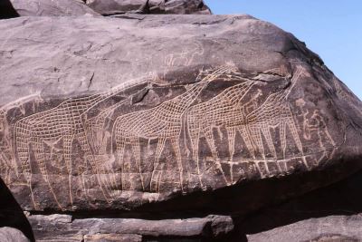 Gravures rupestres de Tanakom : girafes et bovidés au temps où le Sahara était vert.